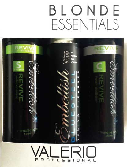 The Blonde Essentials pack gives clients all the tools they need to maintain beautiful blondes. Revive Protein Cleanser - Repairs & Strengthens BlueSteel Shampoo - Tones, Moisturises & Protects from UV Revive Protein Conditioner - Repairs & Restores with the perfect balance of proteins, vitamins & moisture